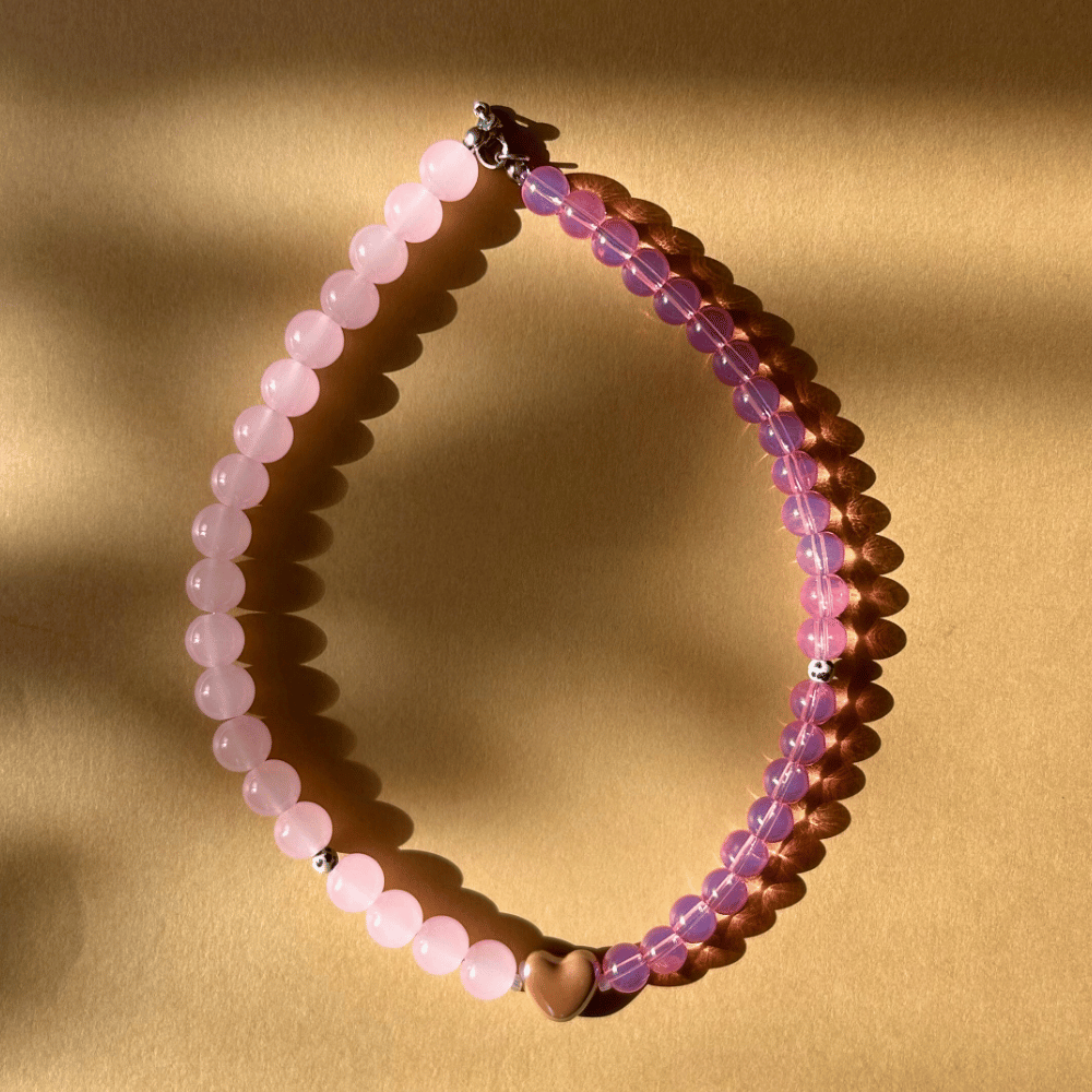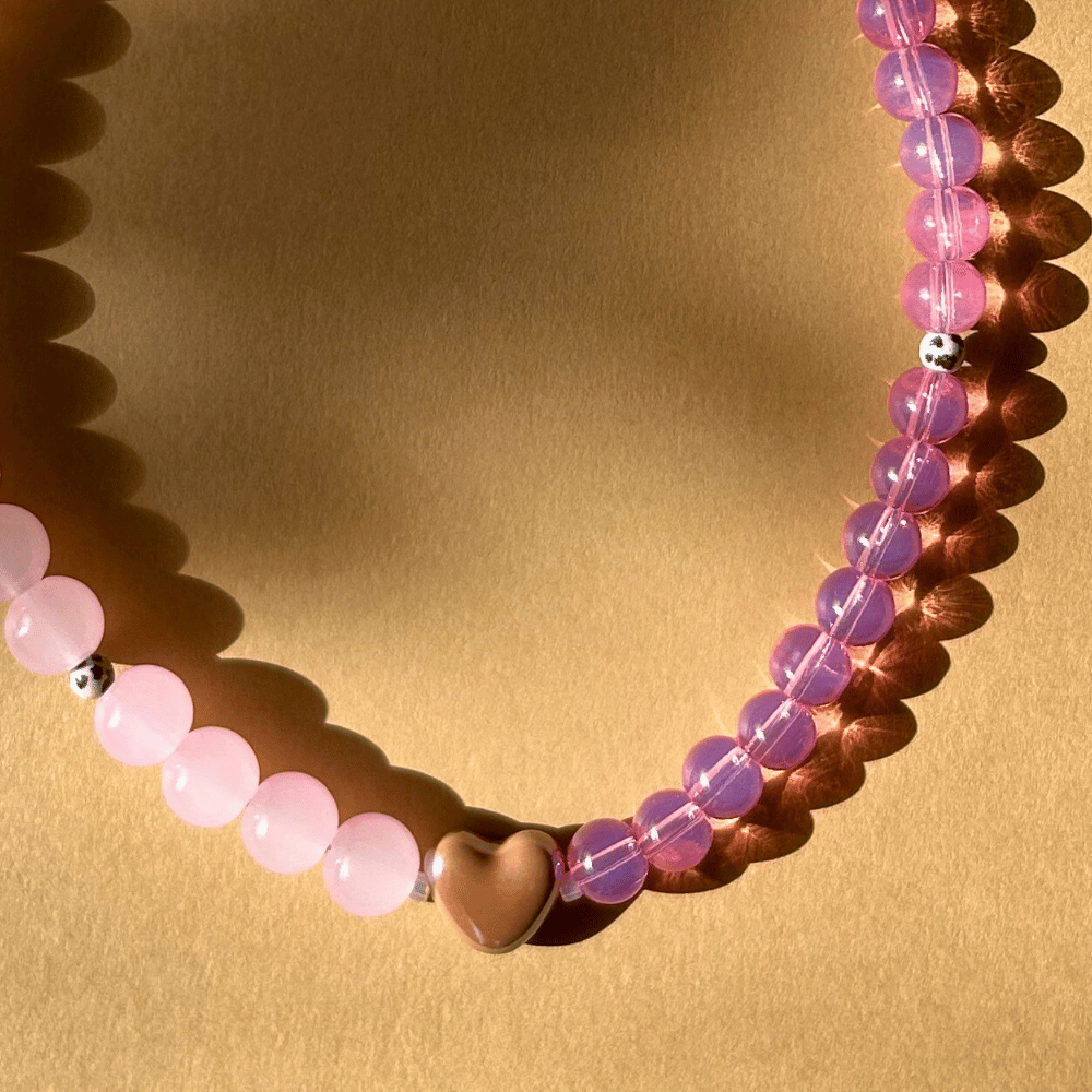 Wyrazisty, a jednocześnie bardzo harmonijny model typu pół na pół. Jedna połowa wykonana z różowych szklanych koralików 10 mm, druga z różowych 8 mm — różnica wielkości daje ciekawy rytm i nowoczesny efekt.