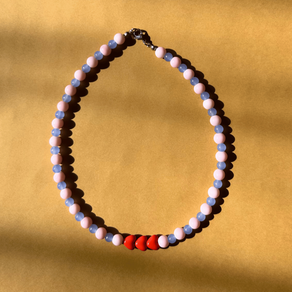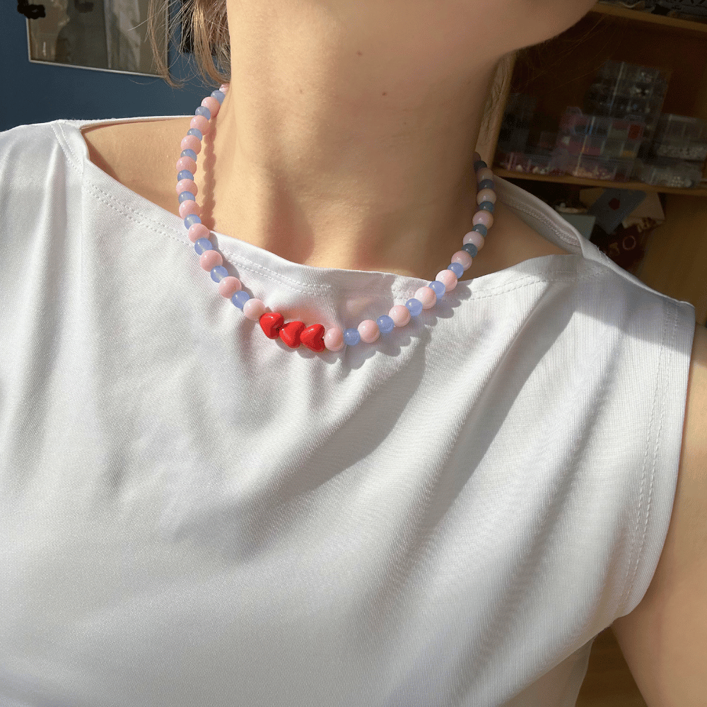 Kolorowy, lekki naszyjnik wykonany ze szklanych koralików 8 mm i 6 mm w odcieniach różu i niebieskiego, który pięknie rozświetla każdą stylizację.