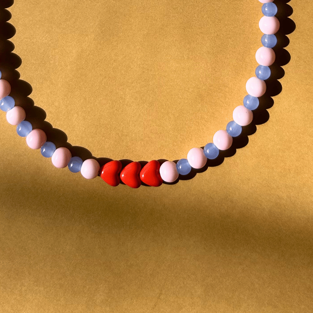 Centralnym akcentem są trzy czerwone serduszka, dodające całości subtelnej, romantycznej nuty i charakteru. To propozycja idealna zarówno do codziennych zestawów, jak i na wyjątkowe okazje, gdy chcesz podkreślić swoją indywidualność.